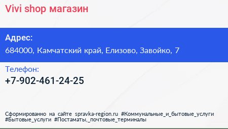 Vivi shop, магазин по адресу 684000, Камчатский край, Елизово, Завойко, 7 в дальнейшем Организация, размещена в следующих категориях: