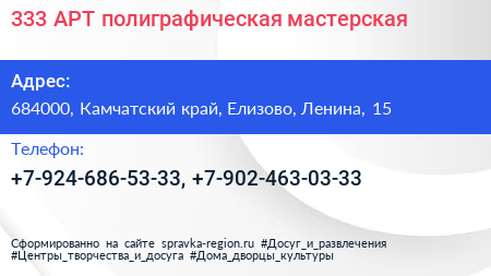 333 АРТ, полиграфическая мастерская по адресу 684000, Камчатский край, Елизово, Ленина, 15 в дальнейшем Организация, размещена в следующих категориях: