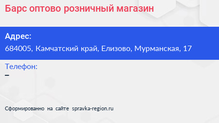 Барс, оптово-розничный магазин по адресу 684005, Камчатский край, Елизово, Мурманская, 17 в дальнейшем Организация, размещена в следующих категориях: