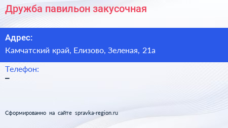 Дружба, павильон-закусочная по адресу Камчатский край, Елизово, Зеленая, 21а в дальнейшем Организация, размещена в следующих категориях: