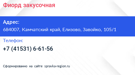 Фиорд, закусочная по адресу 684007, Камчатский край, Елизово, Завойко, 105/1 в дальнейшем Организация, размещена в следующих категориях: