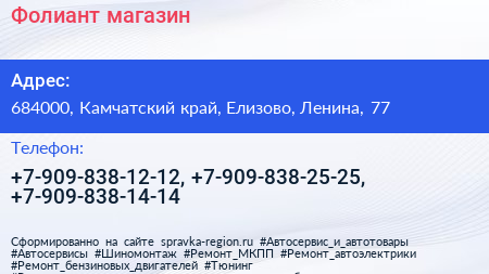 Фолиант, магазин по адресу 684000, Камчатский край, Елизово, Ленина, 77 в дальнейшем Организация, размещена в следующих категориях: