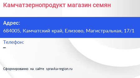 Камчатзернопродукт, магазин семян по адресу 684005, Камчатский край, Елизово, Магистральная, 17/1 в дальнейшем Организация, размещена в следующих категориях: