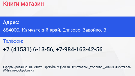 Книги, магазин по адресу 684000, Камчатский край, Елизово, Завойко, 3 в дальнейшем Организация, размещена в следующих категориях: