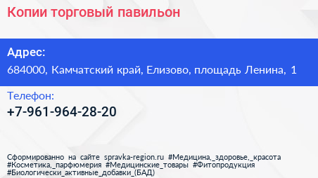 Копии, торговый павильон по адресу 684000, Камчатский край, Елизово, площадь Ленина, 1 в дальнейшем Организация, размещена в следующих категориях: