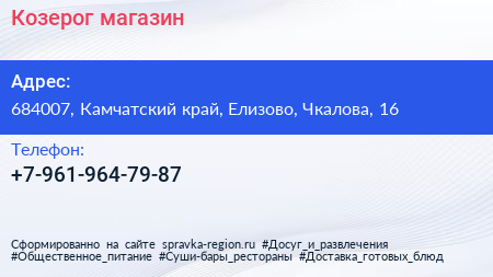 Козерог, магазин по адресу 684007, Камчатский край, Елизово, Чкалова, 16 в дальнейшем Организация, размещена в следующих категориях: