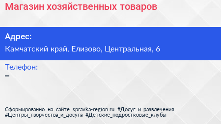 Магазин хозяйственных товаров по адресу Камчатский край, Елизово, Центральная, 6 в дальнейшем Организация, размещена в следующих категориях: