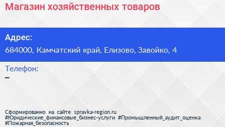 Магазин хозяйственных товаров по адресу 684000, Камчатский край, Елизово, Завойко, 4 в дальнейшем Организация, размещена в следующих категориях: