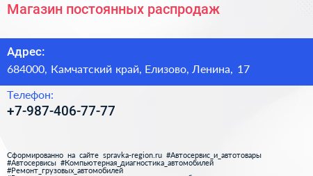 Магазин постоянных распродаж по адресу 684000, Камчатский край, Елизово, Ленина, 17 в дальнейшем Организация, размещена в следующих категориях: