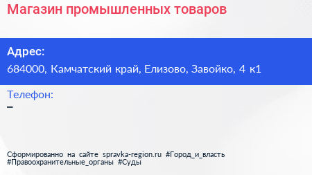 Магазин промышленных товаров по адресу 684000, Камчатский край, Елизово, Завойко, 4 к1 в дальнейшем Организация, размещена в следующих категориях: