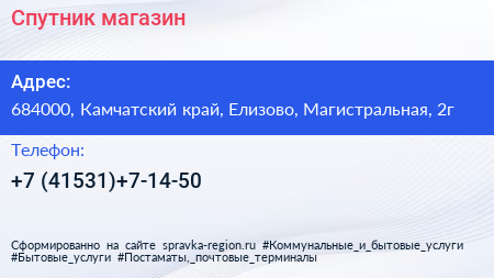 Спутник, магазин по адресу 684000, Камчатский край, Елизово, Магистральная, 2г в дальнейшем Организация, размещена в следующих категориях: