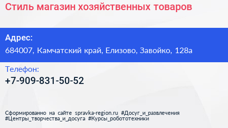 Стиль, магазин хозяйственных товаров по адресу 684007, Камчатский край, Елизово, Завойко, 128а в дальнейшем Организация, размещена в следующих категориях: