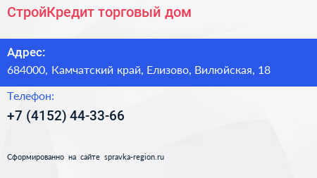 СтройКредит, торговый дом по адресу 684000, Камчатский край, Елизово, Вилюйская, 18 в дальнейшем Организация, размещена в следующих категориях: