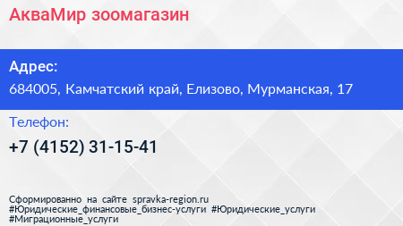 АкваМир, зоомагазин по адресу 684005, Камчатский край, Елизово, Мурманская, 17 в дальнейшем Организация, размещена в следующих категориях: