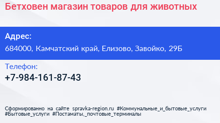 Бетховен, магазин товаров для животных по адресу 684000, Камчатский край, Елизово, Завойко, 29Б в дальнейшем Организация, размещена в следующих категориях:
