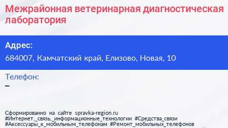 Межрайонная ветеринарная диагностическая лаборатория по адресу 684007, Камчатский край, Елизово, Новая, 10 в дальнейшем Организация, размещена в следующих категориях: