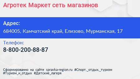 Агротек Маркет, сеть магазинов по адресу 684005, Камчатский край, Елизово, Мурманская, 17 в дальнейшем Организация, размещена в следующих категориях: