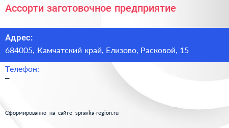 Ассорти, заготовочное предприятие по адресу 684005, Камчатский край, Елизово, Расковой, 15 в дальнейшем Организация, размещена в следующих категориях: