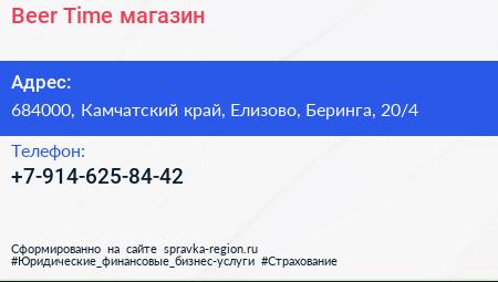 Beer Time, магазин по адресу 684000, Камчатский край, Елизово, Беринга, 20/4 в дальнейшем Организация, размещена в следующих категориях:
