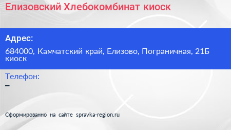 Елизовский Хлебокомбинат, киоск по адресу 684000, Камчатский край, Елизово, Пограничная, 21Б киоск в дальнейшем Организация, размещена в следующих категориях: