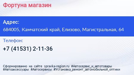 Фортуна, магазин по адресу 684005, Камчатский край, Елизово, Магистральная, 64 в дальнейшем Организация, размещена в следующих категориях: