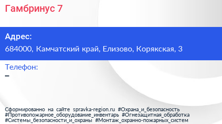 Гамбринус-7 по адресу 684000, Камчатский край, Елизово, Корякская, 3 в дальнейшем Организация, размещена в следующих категориях: