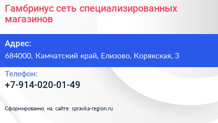 Гамбринус, сеть специализированных магазинов по адресу 684000, Камчатский край, Елизово, Корякская, 3 в дальнейшем Организация, размещена в следующих категориях: