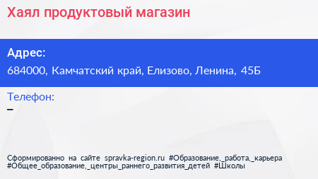 Хаял, продуктовый магазин по адресу 684000, Камчатский край, Елизово, Ленина, 45Б в дальнейшем Организация, размещена в следующих категориях: