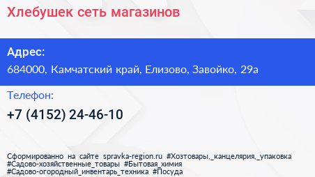 Хлебушек, сеть магазинов по адресу 684000, Камчатский край, Елизово, Завойко, 29а в дальнейшем Организация, размещена в следующих категориях: