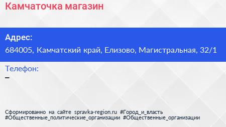 Камчаточка, магазин по адресу 684005, Камчатский край, Елизово, Магистральная, 32/1 в дальнейшем Организация, размещена в следующих категориях: