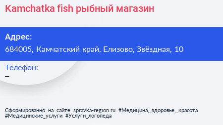 Kamchatka fish, рыбный магазин по адресу 684005, Камчатский край, Елизово, Звёздная, 10 в дальнейшем Организация, размещена в следующих категориях: