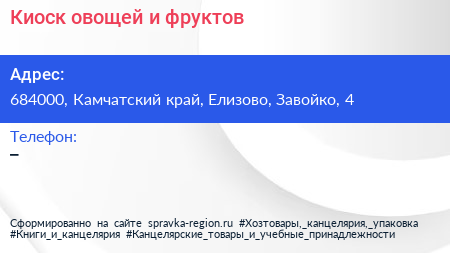 Киоск овощей и фруктов по адресу 684000, Камчатский край, Елизово, Завойко, 4 в дальнейшем Организация, размещена в следующих категориях: