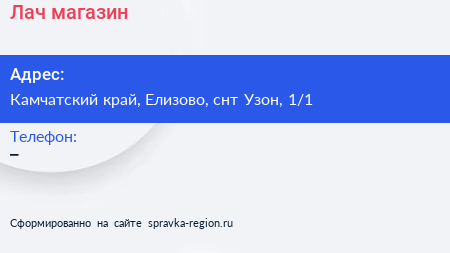 Лач, магазин по адресу Камчатский край, Елизово, снт Узон, 1/1 в дальнейшем Организация, размещена в следующих категориях:
