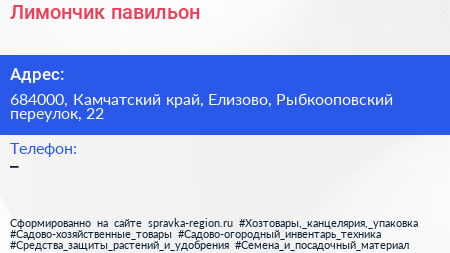 Лимончик, павильон по адресу 684000, Камчатский край, Елизово, Рыбкооповский переулок, 22 в дальнейшем Организация, размещена в следующих категориях: