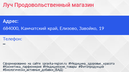 Луч, Продовольственный магазин по адресу 684000, Камчатский край, Елизово, Завойко, 19 в дальнейшем Организация, размещена в следующих категориях: