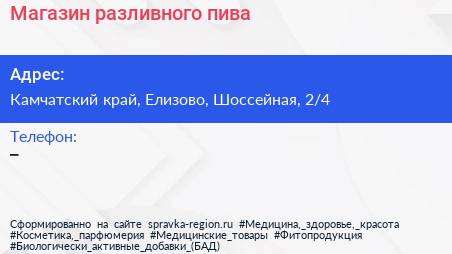 Магазин разливного пива по адресу Камчатский край, Елизово, Шоссейная, 2/4 в дальнейшем Организация, размещена в следующих категориях:
