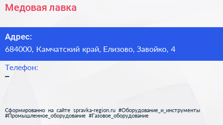 Медовая лавка по адресу 684000, Камчатский край, Елизово, Завойко, 4 в дальнейшем Организация, размещена в следующих категориях: