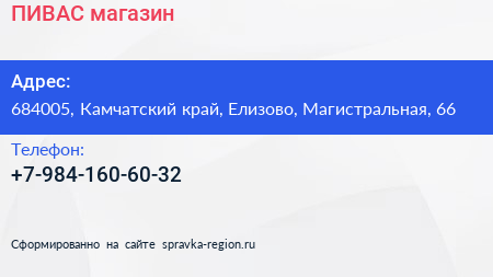 ПИВАС, магазин по адресу 684005, Камчатский край, Елизово, Магистральная, 66 в дальнейшем Организация, размещена в следующих категориях:
