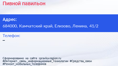 Пивной павильон по адресу 684000, Камчатский край, Елизово, Ленина, 41/2 в дальнейшем Организация, размещена в следующих категориях: