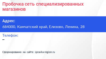 Пробочка, сеть специализированных магазинов по адресу 684000, Камчатский край, Елизово, Ленина, 28 в дальнейшем Организация, размещена в следующих категориях: