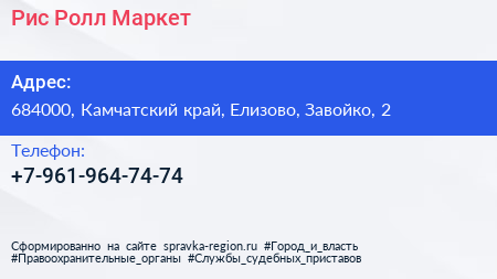 Рис Ролл Маркет по адресу 684000, Камчатский край, Елизово, Завойко, 2 в дальнейшем Организация, размещена в следующих категориях: