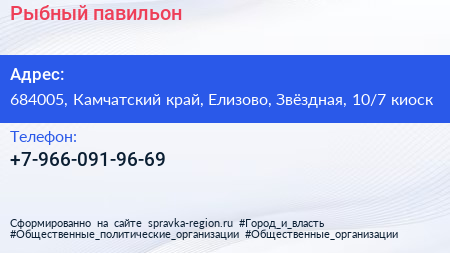 Рыбный павильон по адресу 684005, Камчатский край, Елизово, Звёздная, 10/7 киоск в дальнейшем Организация, размещена в следующих категориях: