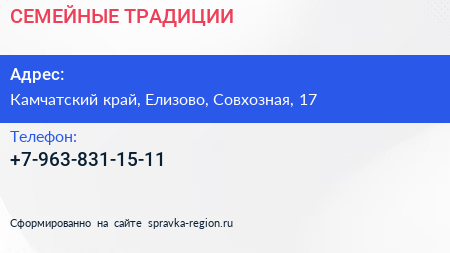 СЕМЕЙНЫЕ ТРАДИЦИИ по адресу Камчатский край, Елизово, Совхозная, 17 в дальнейшем Организация, размещена в следующих категориях: