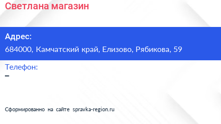 Светлана, магазин по адресу 684000, Камчатский край, Елизово, Рябикова, 59 в дальнейшем Организация, размещена в следующих категориях: