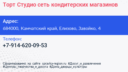 Торт Студио, сеть кондитерских магазинов по адресу 684000, Камчатский край, Елизово, Завойко, 4 в дальнейшем Организация, размещена в следующих категориях: