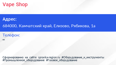 Vape Shop по адресу 684000, Камчатский край, Елизово, Рябикова, 1а в дальнейшем Организация, размещена в следующих категориях: