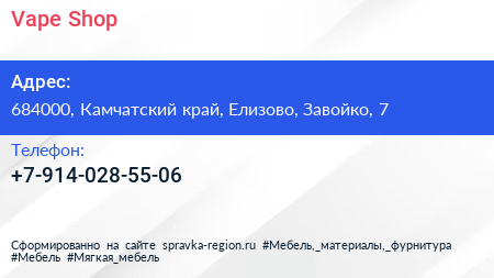 Vape Shop по адресу 684000, Камчатский край, Елизово, Завойко, 7 в дальнейшем Организация, размещена в следующих категориях: