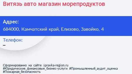 Витязь-авто, магазин морепродуктов по адресу 684000, Камчатский край, Елизово, Завойко, 4 в дальнейшем Организация, размещена в следующих категориях: