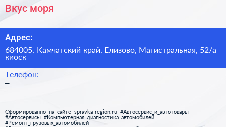Вкус моря по адресу 684005, Камчатский край, Елизово, Магистральная, 52/а киоск в дальнейшем Организация, размещена в следующих категориях: