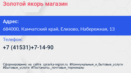 Золотой якорь, магазин по адресу 684000, Камчатский край, Елизово, Набережная, 13 в дальнейшем Организация, размещена в следующих категориях: